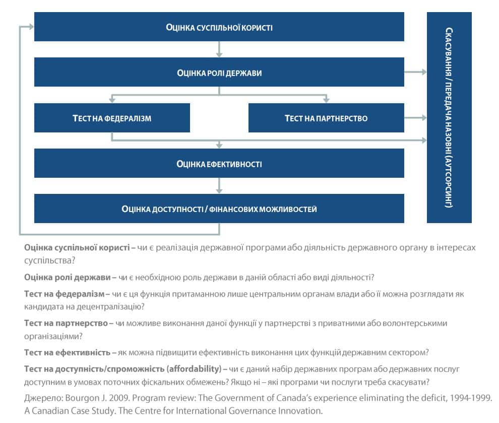 Алгоритм, що лежить в основі канадської технології, передбачає декілька етапів: оцінка суспільної користі, оцінка ролі держави, тест на федералізм, тест на партнерство, тест на ефективність, тест на доступність. За результатами етапів певні функції держави можуть бути скасовані або передані на зовні (аутсорсинг).