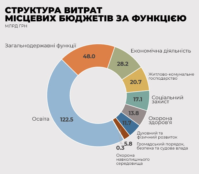 За функціональною класифікацією близько 45% видатків ідуть на освіту (фінансуються частково завдяки субвенціям з державного бюджету). Друга найбільша стаття – загальнодержавні функції (48 млрд грн) – це видатки на органи управління та міжбюджетні трансферти.