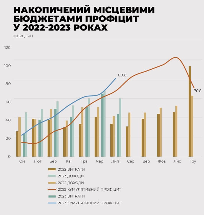 За сім місяців 2023 року накопичений профіцит місцевих бюджетів становив 80,6 млрд грн, що на 13 млрд грн більше, ніж за аналогічний період 2022 року.