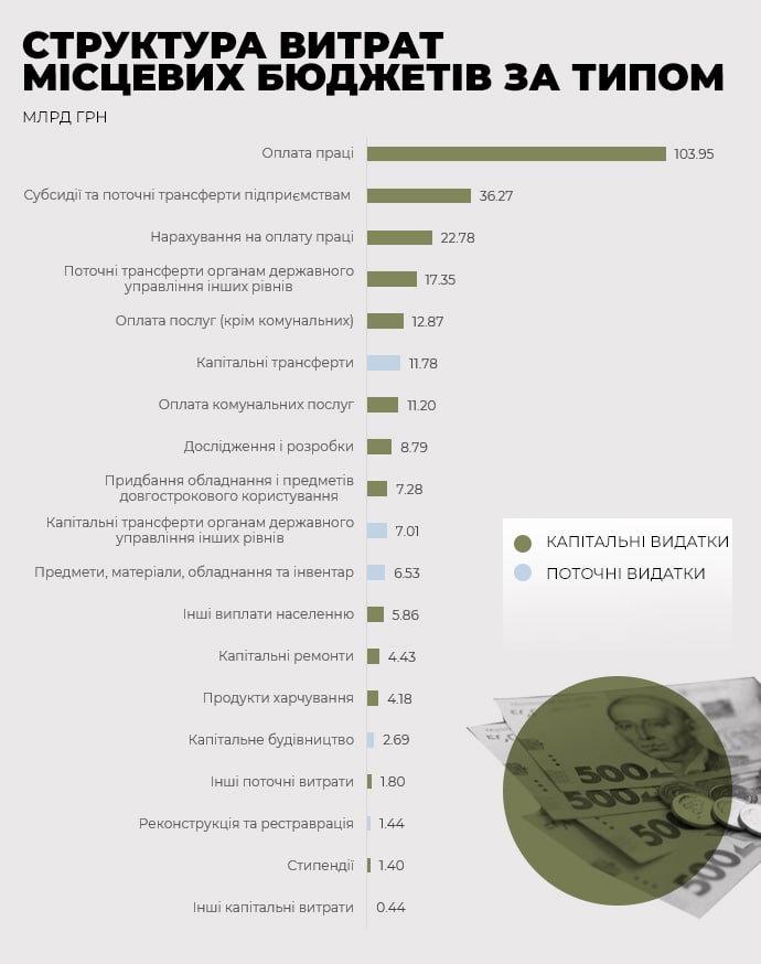 Для багатьох може стати несподіваною інформація про те, що капітальні видатки в місцевих бюджетах становлять менше 13%. Левова частка припадає на оплату праці, субсидії, поточні трансферти підприємствам та органам держуправління.