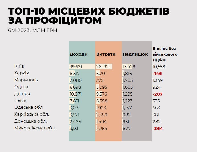 Істотні профіцити мають Харків і Маріуполь (завдяки зменшенню видатків та збереженню надходжень ПДФО від великих платників), Одеса, Дніпро, Львів, Одеська, Харківська, Донецька, Миколаївська області. Без “військового” ПДФО бюджети Харкова, Дніпра та Миколаївської області були б дефіцитними.