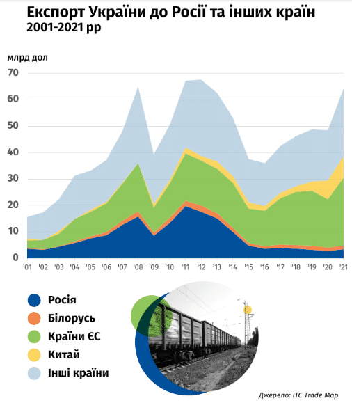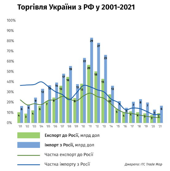 У 2011 році до агресора було спрямовано 29% усіх експортних товарів, у 2021 році – лише 5%. З 2014 року основним торговельним партнером України став Європейський Союз.