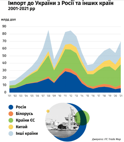Після анексії Криму та початку війни на Донбасі у 2014 році Україна різко скоротила співпрацю з агресором. У 2021 році товарообіг між країнами становив 9 млрд дол – уп’ятеро менше, ніж у 2011 році.