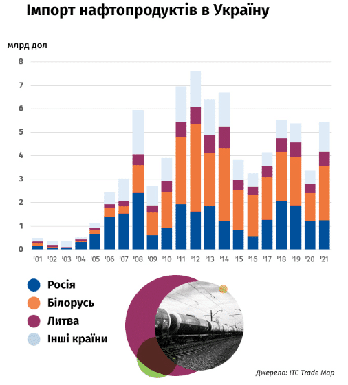 Водночас з Росії українці завозили нафту та нафтопродукти, на які в різні роки припадали 40-60% усього імпорту з РФ. Країна продовжувала міцно сидіти на російській нафтовій голці навіть після початку війни у 2014 році.