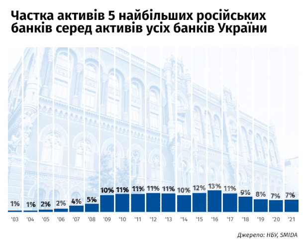 Почавши агресивне нарощування присутності ще під час Світової фінансової кризи 2008 року, російські банки за каденції Віктора Януковича збільшили частку своїх активів у банківській системі України до 10-11%.