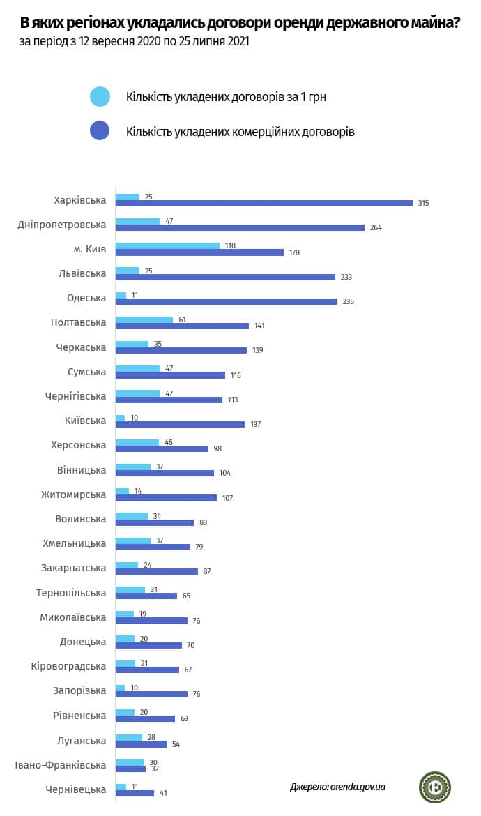 Цікаво, що в деяких областях продовжують здавати велику частину майна за 1 грн на рік. Зокрема, в Івано-Франківській області це 54%, а в Херсонській – 38% договорів, укладених з початку дії нового закону.