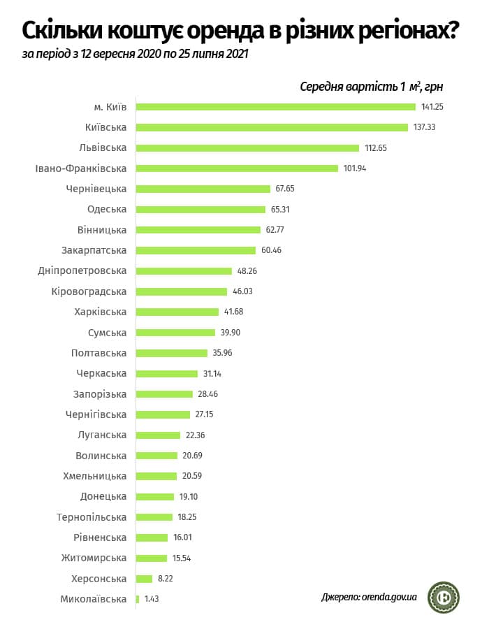 Разом з тим, Київ та Івано-Франківська область – також серед лідерів за доходами від оренди в розрахунку на 1 квадратний метр (без урахування пільгових договорів за 1 грн на рік). До п’ятірки лідерів також входять Київська, Одеська та Львівська області.