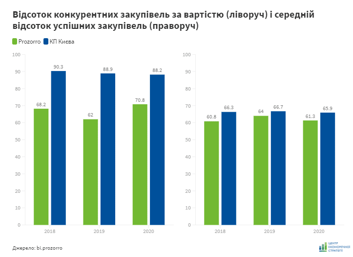 Майже 90% всіх витрат КП на закупівлі (порівняно з 70% в середньому по країні) проходять за конкурентними процедурами, а успішними є майже 66% закупівель, що трохи більше, ніж в середньому по Україні. На ці показники вочевидь вплинуло ухвалене Київською міською радою в 2016 році рішення про обов’язкове використання комунальними підприємствами Prozorro на допорогових закупівлях, які є конкурентними й для успішного завершення яких достатньо подання однієї пропозиції.