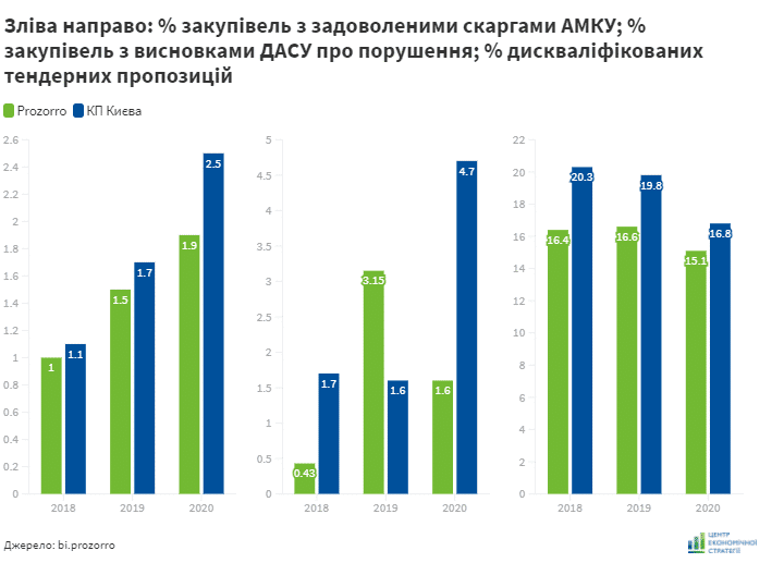Підтвердженням наявності порушень та дискримінації в закупівлях КП є задоволені Антимонопольним комітетом (АМКУ) скарги учасників та порушення, виявлені Державною аудиторською службою (ДАСУ) за результатом моніторингу закупівель. Кількість задоволених АМКУ скарг протягом 2018-2020 років у київських КП була вищою середнього показника в Prozorro, відсоток закупівель із висновками ДАСУ про наявність порушень був вищим середнього показника в 2018 та 2020 роках (рисунок 4).