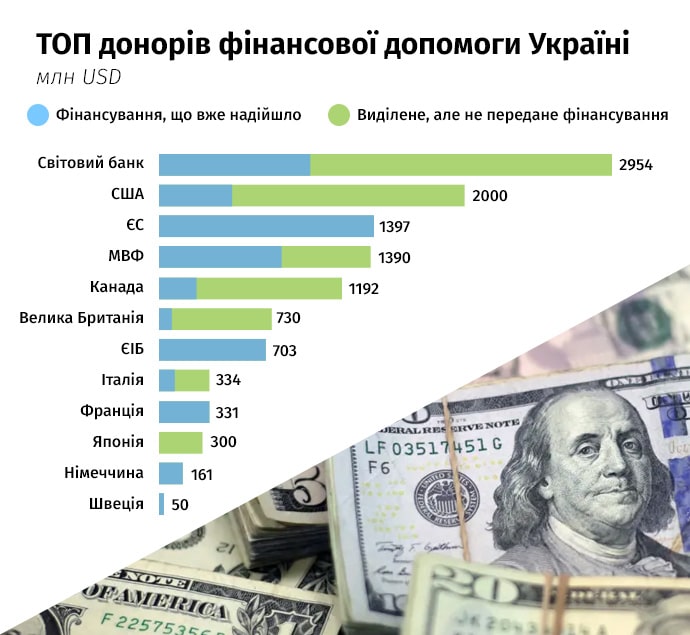 Це фінансування надходить від Світового банку, Європейського інвестиційного банку, МВФ, США, Великобританії та Італії. Остання переказала кошти вже через кілька днів після початку повномасштабного вторгнення.