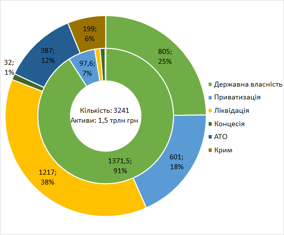 Графік. Тріаж за кількістю (зовнішнє коло) та активами (внутрішнє коло) держпідприємств