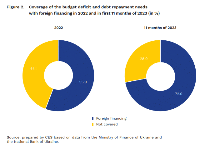 У 2022 році дефіцит бюджету України та витрати на обслуговування боргу сягнули 55,6 млрд доларів США. Зовнішня фінансова підтримка допомогла покрити 31,1 млрд злотих, залишивши дефіцит у розмірі 24,5 млрд доларів США. У 2023 році Україна отримає достатньо глобальної допомоги, щоб уникнути такого розриву: загалом 42 мільярди доларів США фінансової допомоги протягом року.