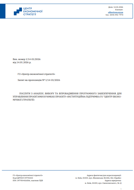 ГО «Центр економічної стратегії» оголошує конкурс пропозицій на надання послуг з аналізу, вибору та впровадження програмного забезпечення для управління проєктами в рамках проєкту «Інституційна підтримка ГО «Центр економічної стратегії».