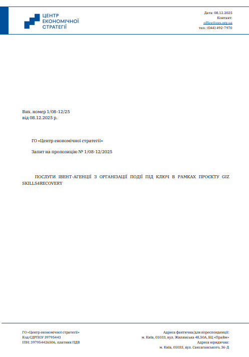 ГО «Центр економічної стратегії» оголошує конкурс пропозицій на надання послуг івент-агенції з організації події під ключ в рамках проєкту Giz skills4recovery, виконавцем якого виступає ГО «Центр економічної стратегії».