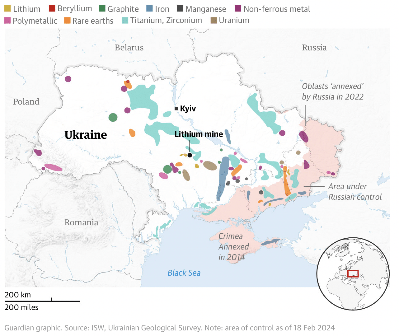 Загальні запаси України оцінюються в $14,8 трлн. До них входять літій, титан і уран, а також вугілля, сталь, залізна руда та сланцевий газ. Багато родовищ не були розроблені, сказав Ланда, або тому що вони були нерентабельними, або через політичну нестабільність.