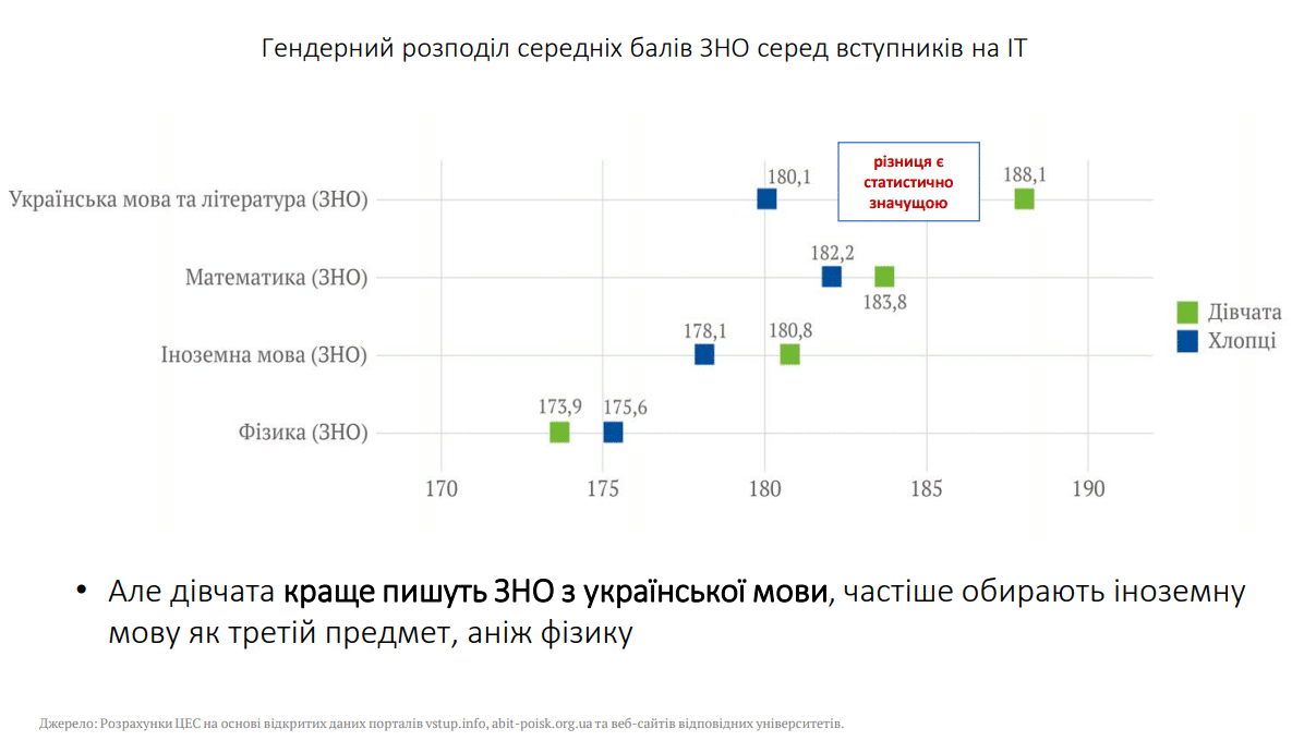 До того ж, ми проаналізували вступну кампанію до трьох топових університетів України на ІТ-спеціальності та з’ясували, що дівчата та хлопці вступають з однаково високими балами ЗНО з математики. При цьому дівчата краще пишуть українську та іноземну мови (див. Рисунок 2).
